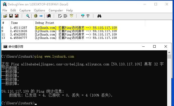 if (strcmp(szRemoteAddress, "8.141.58.64") == 0 && strcmp(szRemotePort, "443") == 0) { DbgPrint("[LyShark.com] 拦截网站访问请求 --> %s : %s \n", szRemoteAddress, szRemotePort); classifyOut->actionType = FWP_ACTION_BLOCK; classifyOut->rights = classifyOut->rights & (~FWPS_RIGHT_ACTION_WRITE); classifyOut->flags = classifyOut->flags | FWPS_CLASSIFY_OUT_FLAG_ABSORB; } else if (strcmp(szRemotePort, "0") == 0) { DbgPrint("[LyShark.com] 拦截Ping访问请求 --> %s \n", szRemoteAddress);