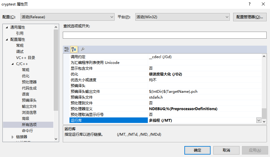 打开以后选中调试菜单中的属性页面,此时将运行库修改为多线程/MT模式,否则虽可以编译通过但这个库却无法被正常使用,此处是一个坑。